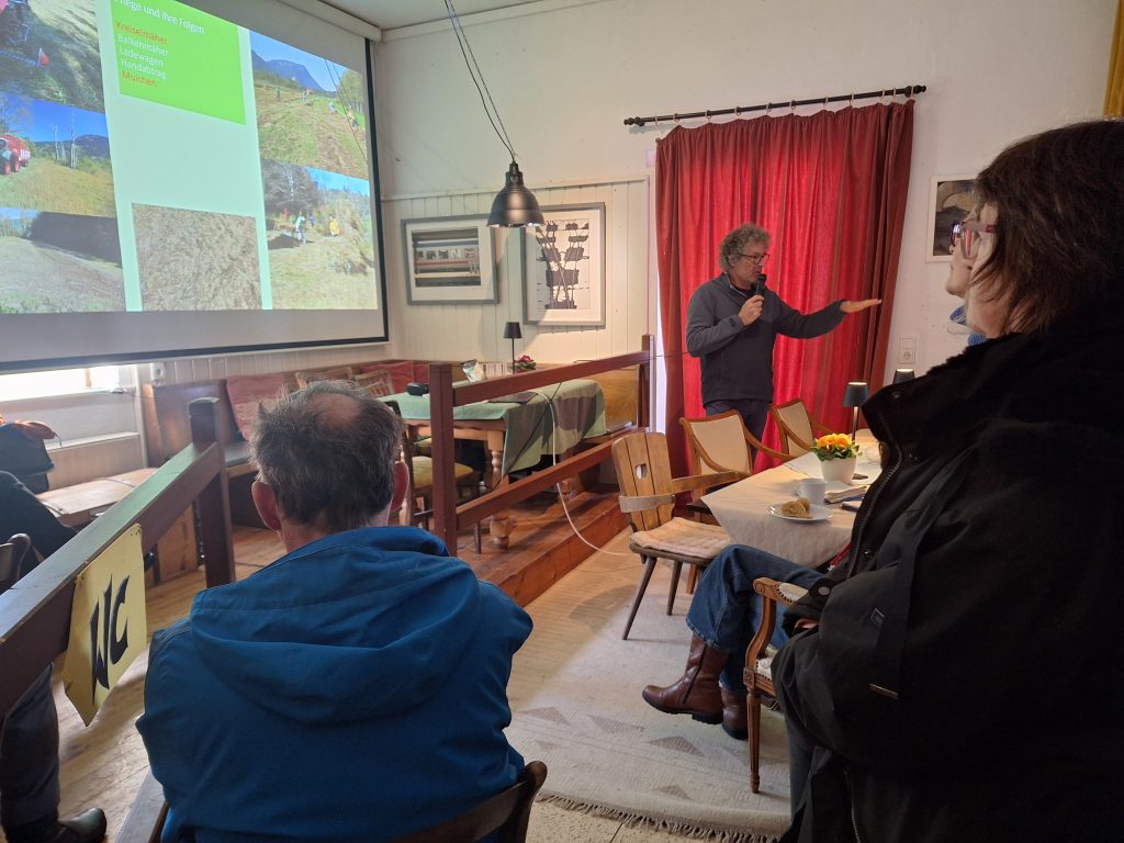 Alfred Karle-Fendt, Vorsitzender des Vereins zur Förderung von Natur und Umweltschutz in Sonthofen sprach zum Thema „Wiesen und Blühflachen im (Klima)Wandel der Zeit. Sein Vortrag überzeugte durch einen weiten Horizont von der Urlandschaft über den Einfluss der Menschen seit dem Mittelalter bis zu den prägenden Entwicklungen in den letzten zwei Jahrhunderten. Daraus ergibt sich unsere Vorstellung einer intakten Blumenwiese. Dabei sind die Blumenwiesen heute mehr denn je gefährdet und bedürfen unseres aktiven Naturschutzes.