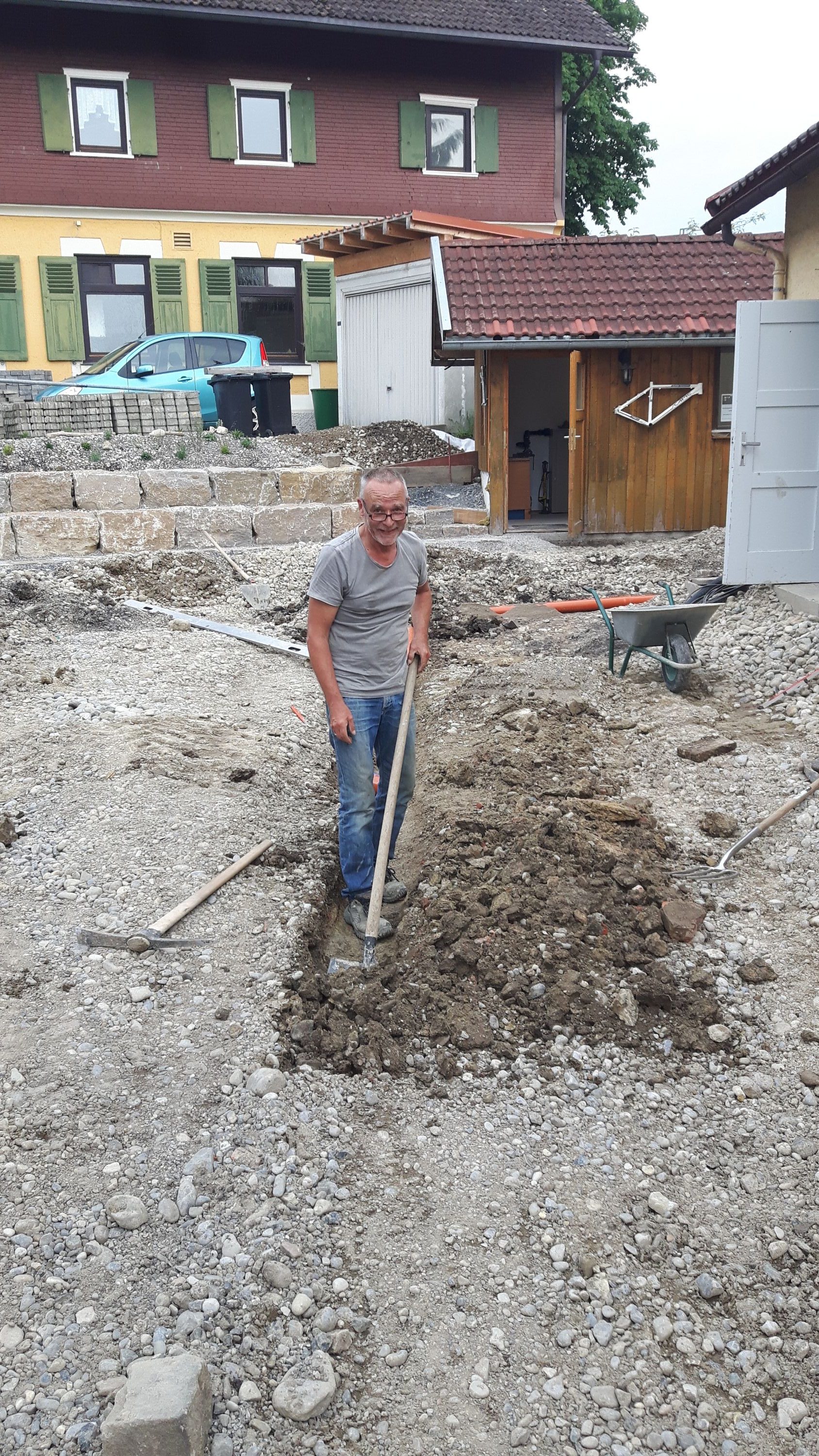 Tags darauf brachten Bauleiter Helmut (Bild unten links) , Schaufelprofi Karl-Heinz und Baggerfahrer Mario alle Regenwasserleitungen „unter die Erde“ und sorgten für fach- und sachgerechte Anschlüsse. Damit sollten alle unterirdischen Maßnahmen abgeschlossen sein. Jetzt gilt es, die entstandenen Löcher aufzufüllen und weitere 50 Tonnen Wandkies im künftigen Bahnhofsgarten zu verteilen…