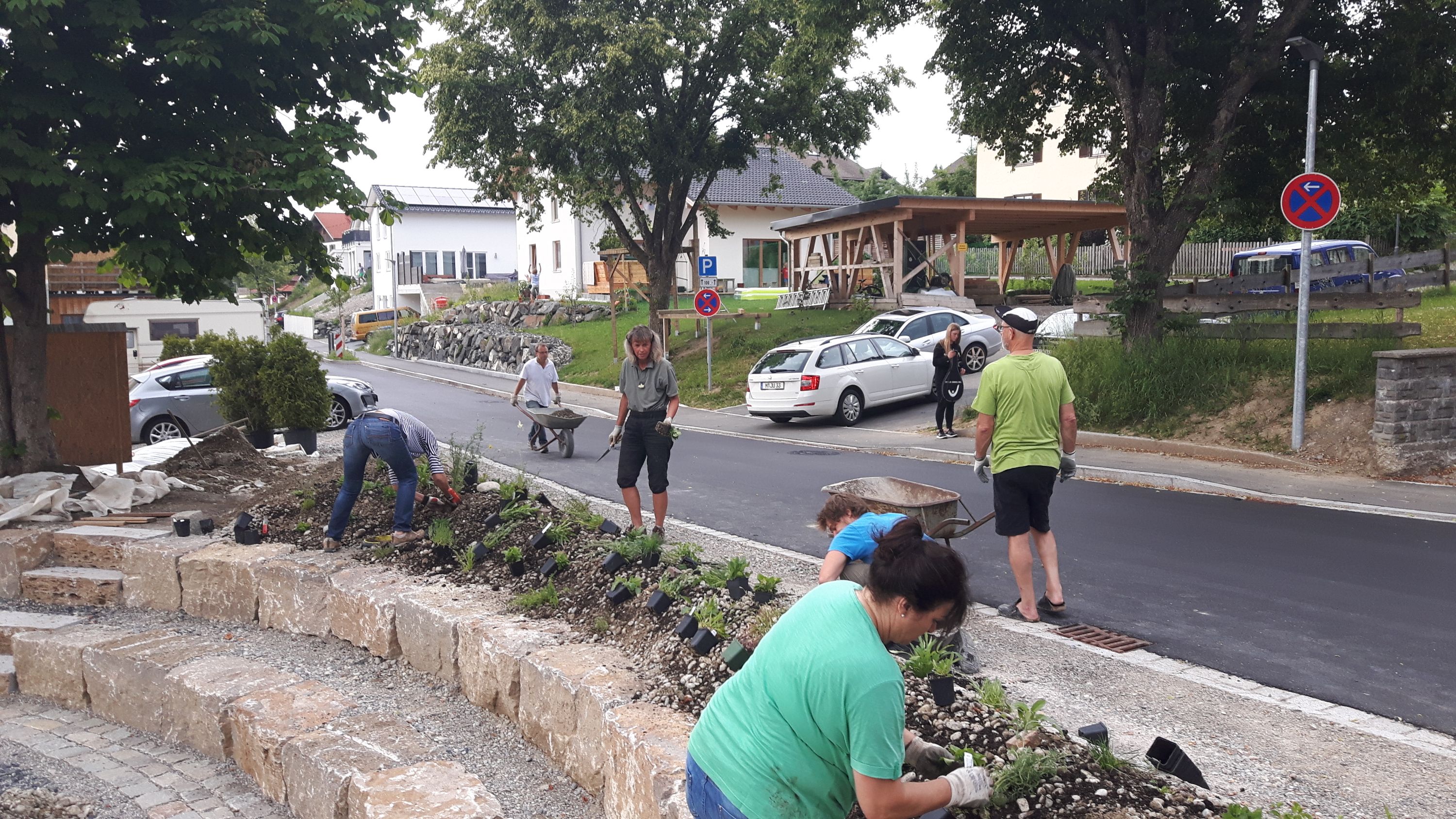 Am Donnerstagabend – auf dem Bahnhofsvorplatz liefen gerade die Aufräumarbeiten des Wochenmarkts – wurde unter Anleitung des Immenstädter Staudengärtner Felix Schmitt (Bild oben, zweiter von links) der Wandkieswall entlang der Bahnhofsstraße von vielen freiwilligen Helfern mit dutzenden von autochthonen Naturgartenpflanzen bestückt.