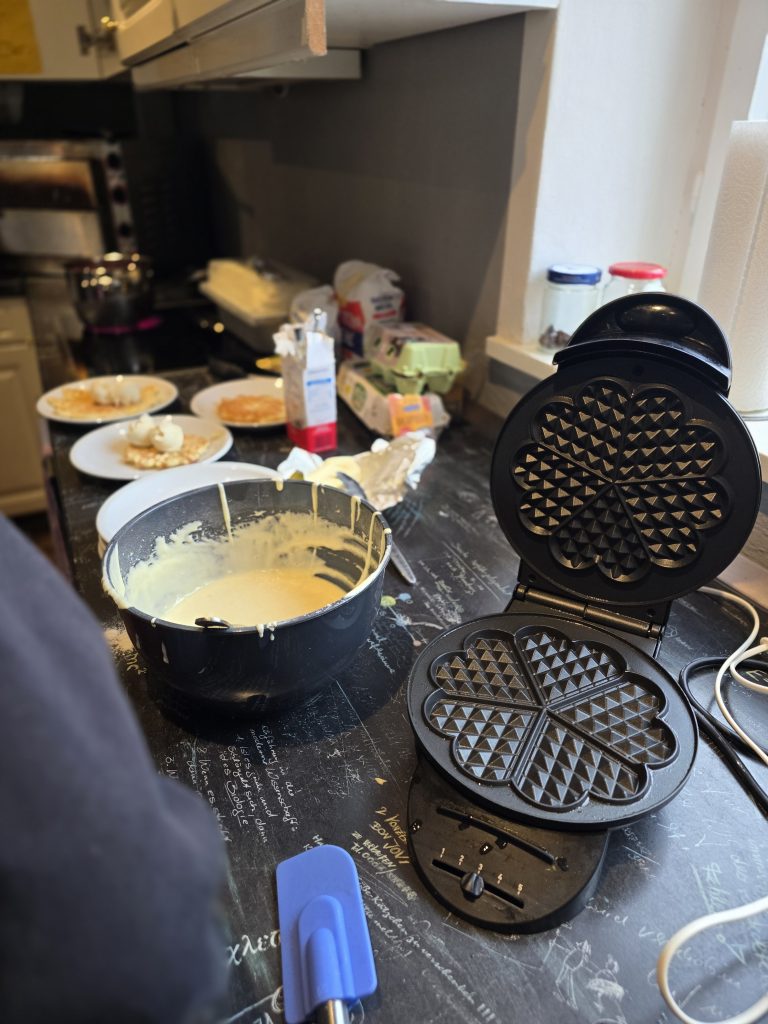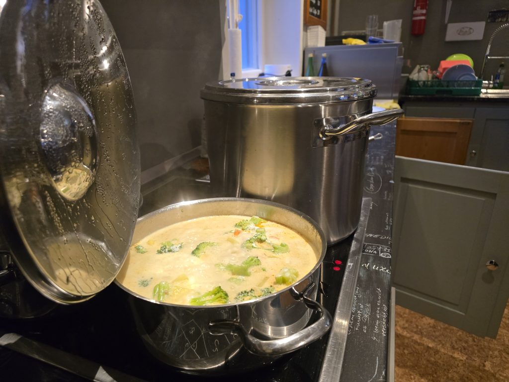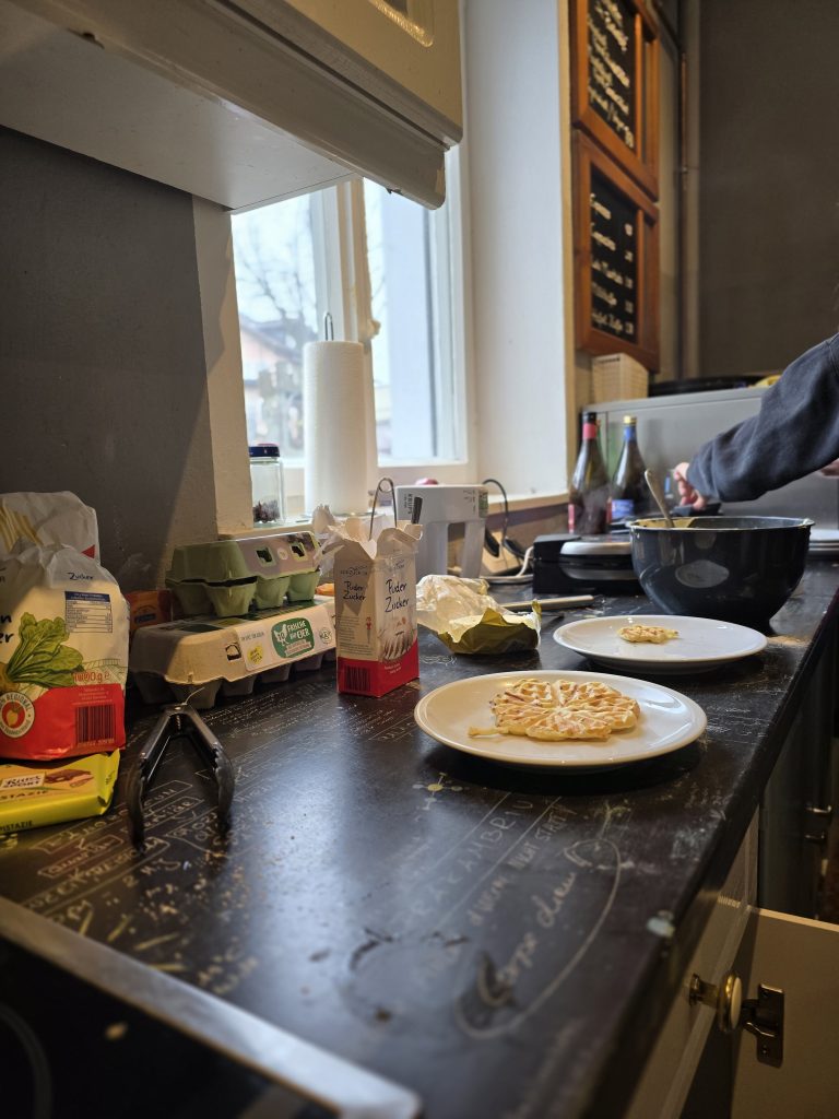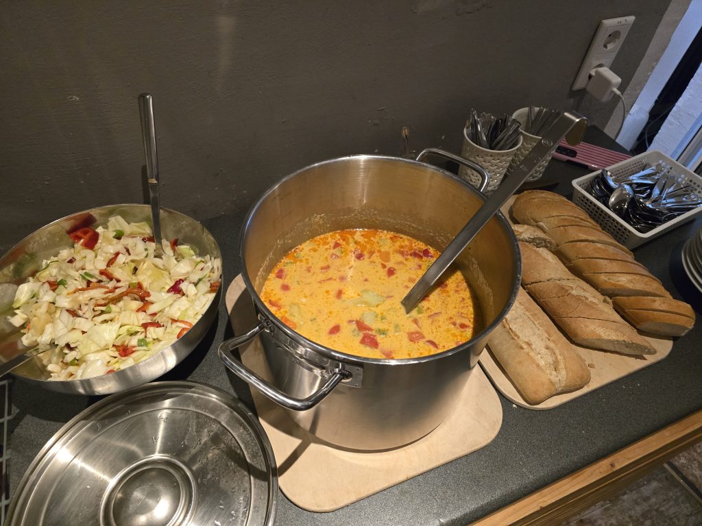 Passend zum Valentinstag wurde es kulinarisch besonders herzlich: Leckere Herzwaffeln mit Eis und heißen Himbeeren versüßten den Nachmittag, begleitet von einem speziellen Valentinstagscocktail. Auch Nussschnecken und ein Schoko-Chili-Kuchen aus dem Bahnhofs-Backbuch fanden reißenden Absatz. Am Abend zauberte Sabrina, die an diesem Tag fürs Kochen verantwortlich war, ein super schmackhaftes veganes Gemüsecurry, bei dem sich viele gern noch einen Nachschlag holten – alles wie immer auf Spendenbasis.
