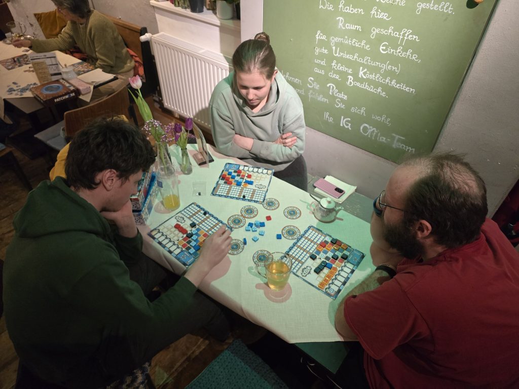 Der spielerische Höhepunkt des Abends waren zwei spannende Runden „Blood on the Clocktower“, ein Social-Deduction-Spiel im Werwolf-Stil – nur viel toller! Bei beiden Runden gelang es dem guten Team erfolgreich, den Dämonen zu besiegen. Spannung bis zum Schluss!