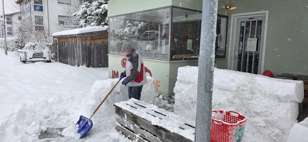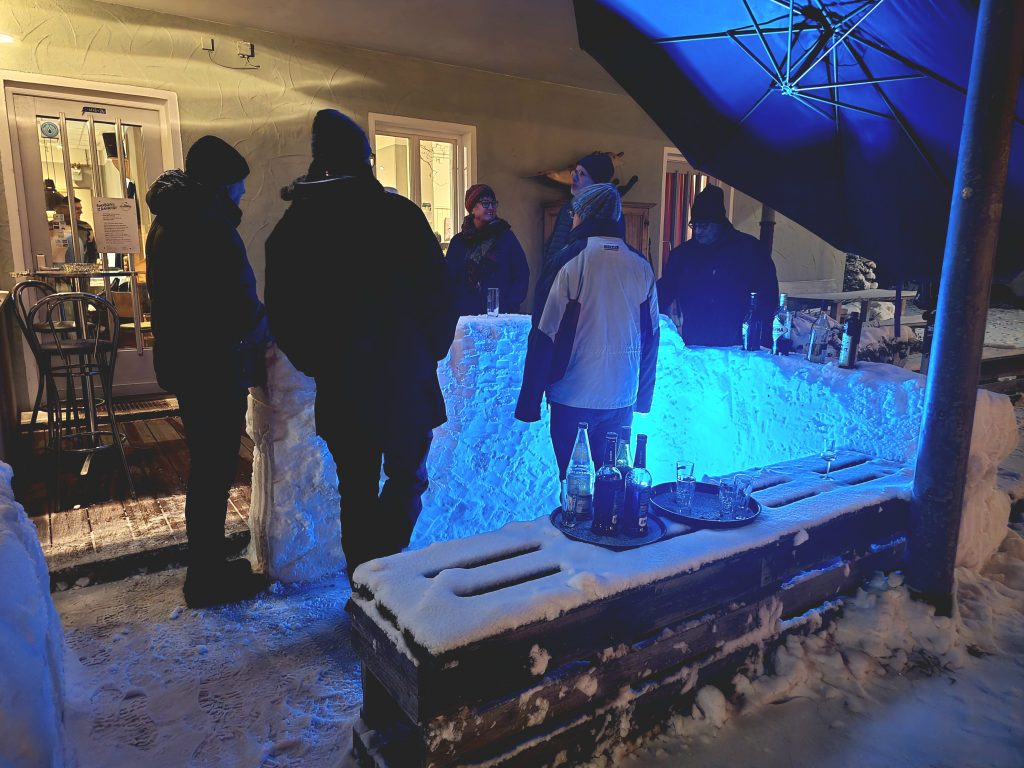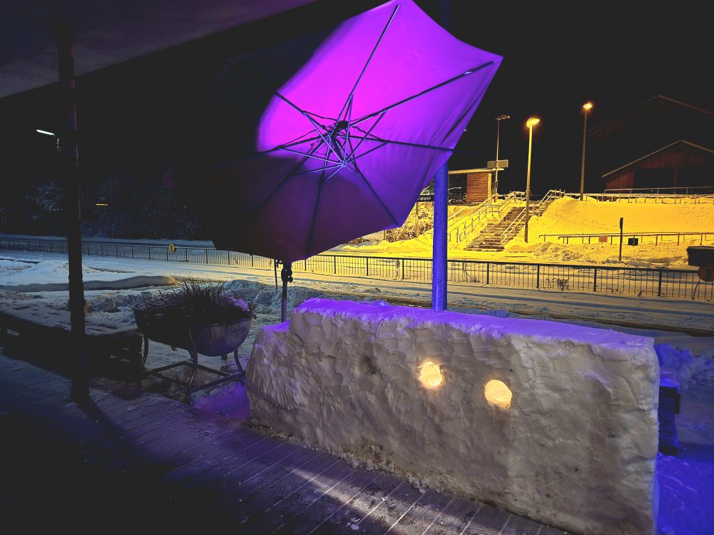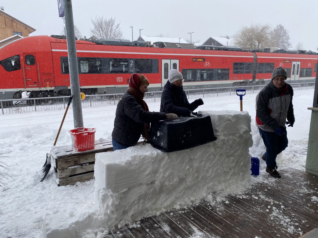 Während am Samstag im Bullerofen-warmen Bahnhof gemütlich gespielt, musiziert, gelesen oder geschlummert wurde, entstand vor der Tür zum Offenen Wohnzimmer ein ebenso spontanes wie eiskaltes Winterprojekt: Die Schneebar 2026. Erdacht und entworfen von Wolfgang, gebaut mit Unterstützung von Linda, Maria und Markus – eingeweiht von allen Gästen mit Lust auf einen kühlen Drink in winterlicher Atmosphäre…